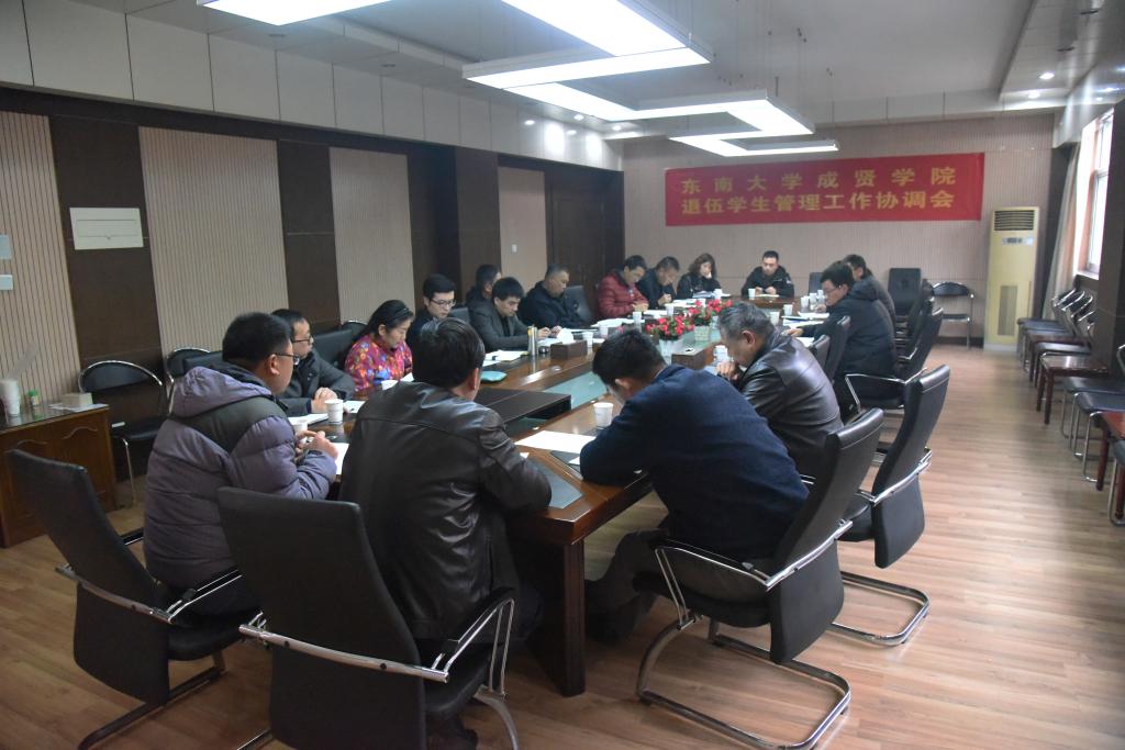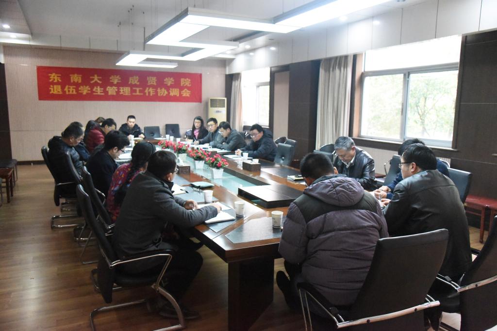 11月29日下午,我校在真知馆二楼会议室召开退伍大学生管理工作协调会。常务副院长郑建勇,党委副书记、副院长王荣,各职能部门负责人,各二级成人视频党总支书记和综合办主任参加会议。会议由人武部部长潘明烽主持。