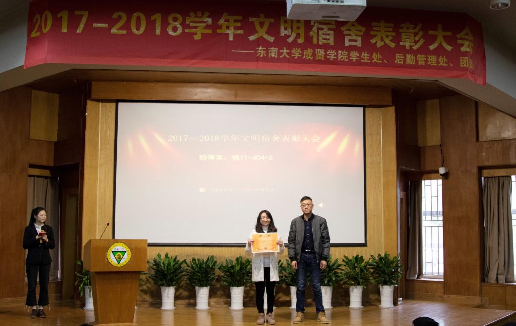 大会伊始,后勤管理处副处长丁秀山宣读了《关于2017-2018学年文明宿舍表彰的决定》;随后,团委书记潘明烽、后勤管理处副处长丁秀山、学生处处长助理颜秉明和后勤管理处赵萍萍四位老师分别为获得文明宿舍特、一、二、三等奖的宿舍颁奖。其中,桃11-404-2宿舍摘得特等奖;一等奖宿舍2个(桃12-307、桃1-420);二等奖宿舍4个(桃12-308、桃13-301、桃18-112、桃1-224);三等奖宿舍有6个(桃3-114、桃17-216、桃18-505、桃16-404、桃17-622、桃3-524)。在对宿管部经理谢春蓉和文明宿舍代表访谈时,谢经理分享了宿舍管理工作的经验,强调了文明宿舍建设的重要性;文明宿舍代表分享了舍友关系相处的小秘诀,讲述了舍友之间互相帮扶的温馨故事。最后,后勤管理处副处长丁秀山老师作了总结讲话。丁老师对受到表彰的先进集体表示祝贺,同时也希望同学们能以宿舍为思想阵地,提高文明素质,加强凝聚力建设,积极构建文明的宿舍文化,共同营造一个温馨、和谐的宿舍氛围。