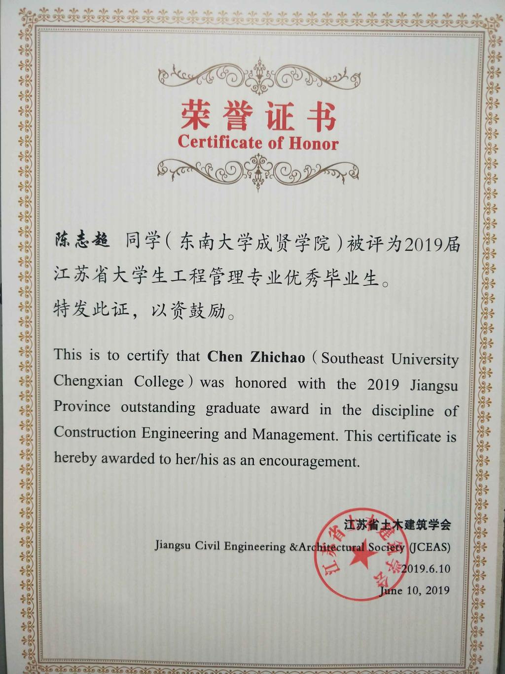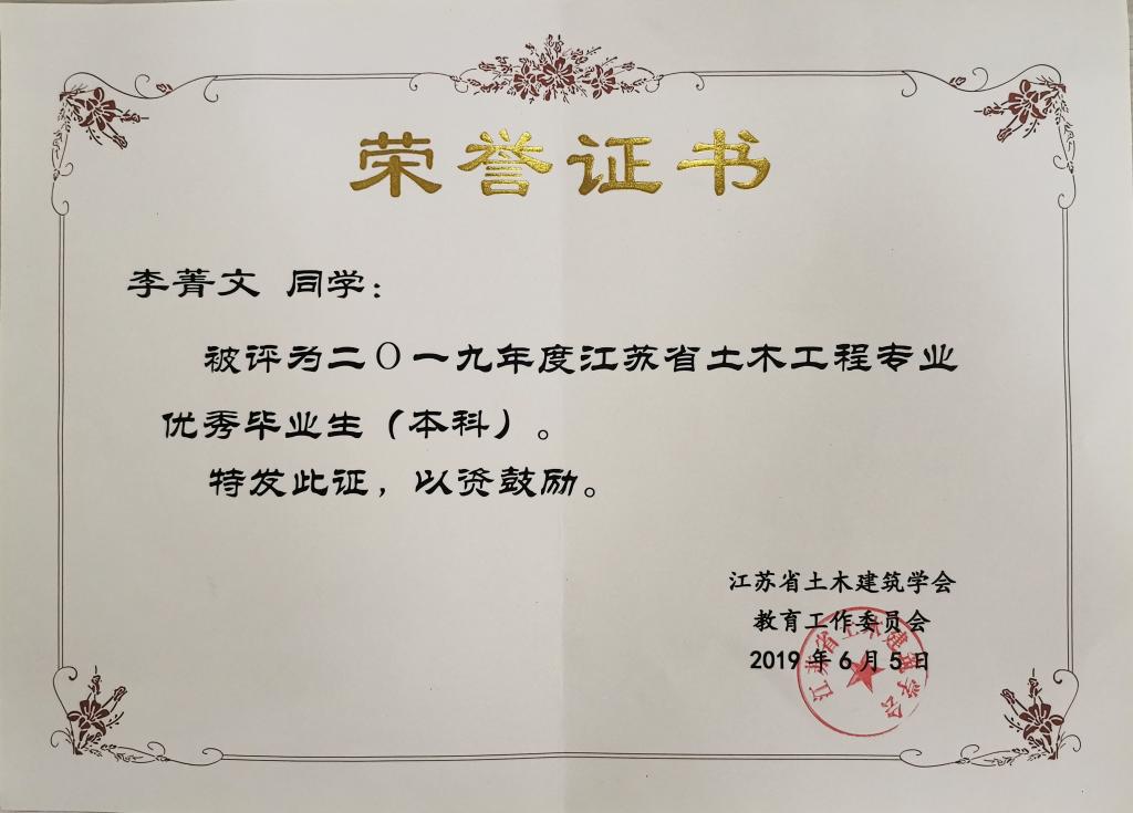 近日,从中国土木工程学会教育工作委员会江苏分会和江苏省土木建筑学会传来喜讯,成人视频-九色成人-做爱视频 成人视频 2019届毕业生李菁文荣获江苏省土木工程专业优秀毕业生,陈志超荣获江苏省工程管理专业优秀毕业生。