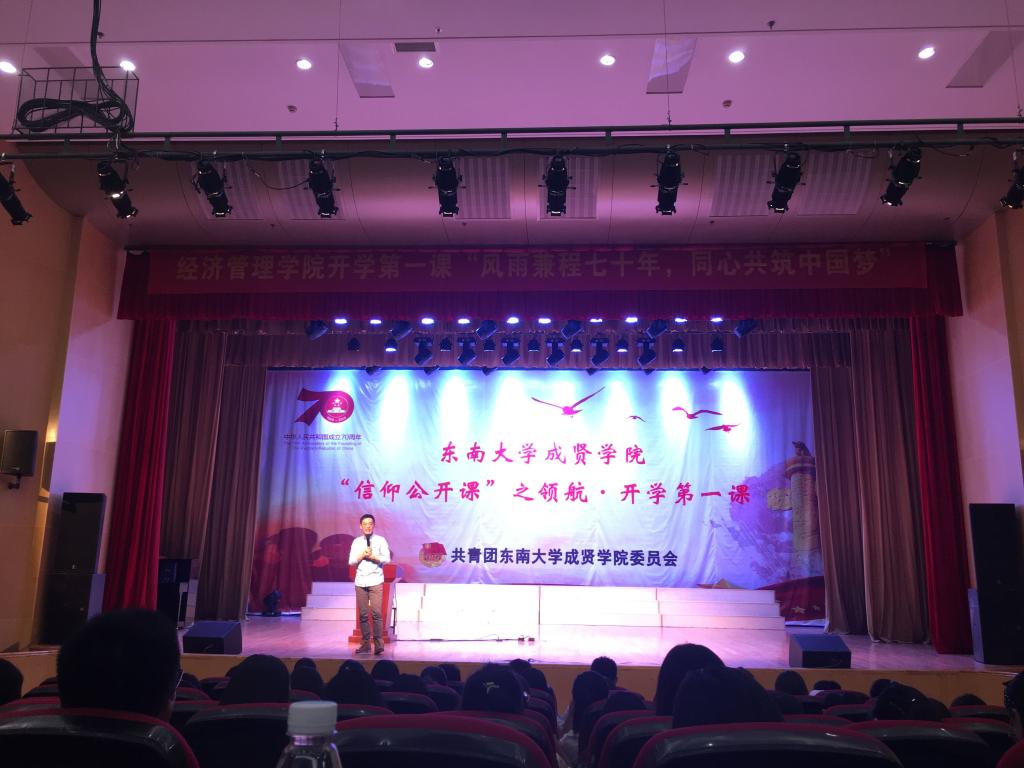 9月24日晚,经济管理成人视频在综合楼313报告厅举办“风雨兼程七十年,同心共筑中国梦”开学第一课主题教育活动。经济管理成人视频党总支副书记李清源,分团委书记苏珍晶,辅导员徐小瑛、胡钱胜与六百多名2019级新生一起参加了活动。