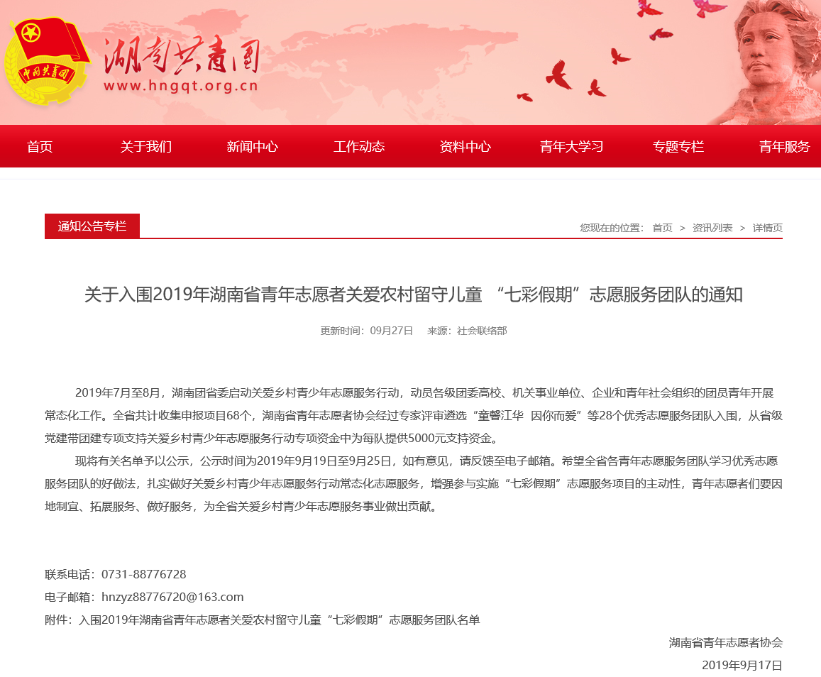 由电子与计算机工程成人视频2017级计算机科学与技术专业李帅同学担任领队的成人视频-九色成人-做爱视频 暑期社会实践团队皮皮支教小分队,在2019年湖南省青年志愿者关爱农村留守儿童“七彩假期”志愿服务项目中获评“优秀志愿服务团队”称号,并得到5000元支持资金。