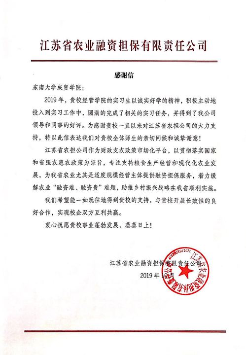 近日,成人视频-九色成人-做爱视频 经济管理成人视频收到一封来自江苏省农业融资担保有限责任公司(以下简称“江苏省农担公司”)的感谢信。信件简短却言语真挚,表达了对经管成人视频实习生诚实好学的肯定、积极工作的赞扬,以及与成人视频建立长效性良好合作的期盼。