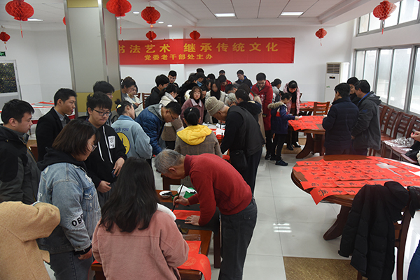 为传承中华传统文化,发挥老同志的政治优势,结合“不忘初心、牢记使命”主题教育,1月7日,成人视频 党委老干部处组织了以“弘扬书法艺术、传承传统文化”为主题的老干部书画进校园、进家庭、进社区活动,成人视频 退休老同志在一食堂梅花厅为我院师生员工写春联、送祝福。