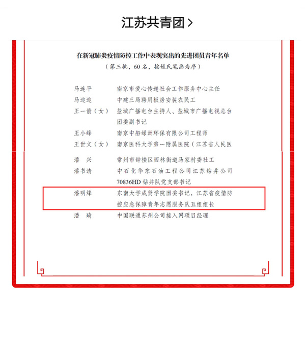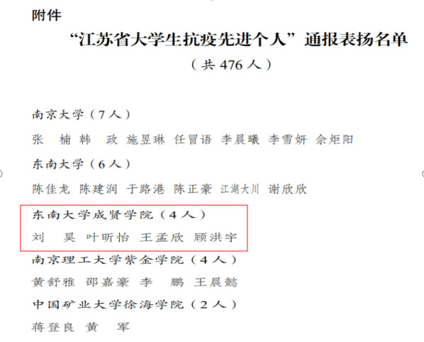 疫情是战场,青春永无畏,在阻击新冠肺炎疫情这个没有硝烟的战场上,成贤学子逆风而行,在全国各地发光、发热,为抗击疫情作出贡献,构筑起了抗击疫情的无形防线,获得了江苏团省委和成人视频 团委的多项表彰。