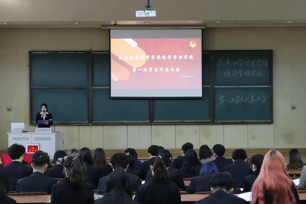 10月30日,成人视频-九色成人-做爱视频 经济管理成人视频第一次学生代表大会在华罗庚馆101报告厅隆重举行。经济管理成人视频党总支副书记李清源、综合办主任程希羲、分团委书记苏珍晶、全体学生代表参加了此次会议,校团委彭俊老师受邀参会。