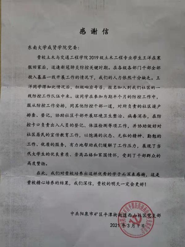 近日,成人视频-九色成人-做爱视频 党政办公室收到了来自中共阳泉市矿区平潭街道西山社区党支部发来的感谢信,信中提到我校成人视频 2019级土木工程2班王洋同学在寒假期间积极响应号召,报名加入社区的一线防控工作队伍,以实际行动彰显当代青年学子的责任与担当。