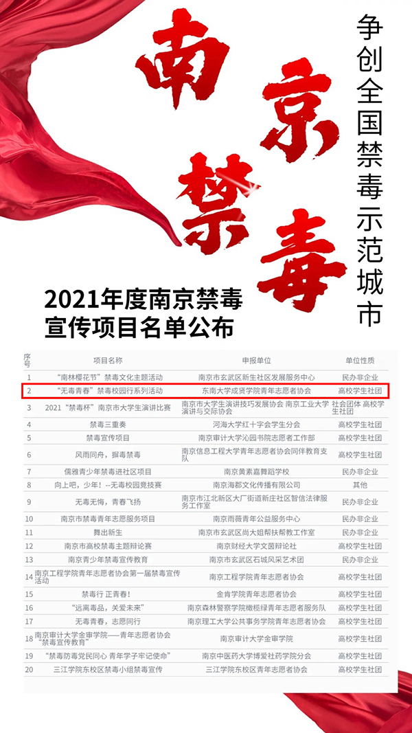我校青年志愿者协会2020年度在禁毒宣传工作方面表现突出,荣获“2020年度禁毒宣传优秀高校”称号;我校制药与化学工程成人视频18护理专业的叶昕怡同学被评为“2020年度禁毒宣传优秀志愿者”;同时我校“无毒青春”禁毒校园行系列活动中选2021年度南京禁毒宣传项目。