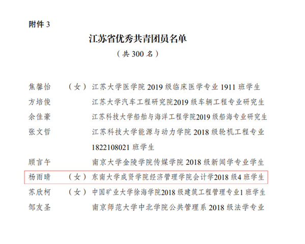 近日,共青团江苏省委下发了《关于表彰2020年度“江苏省优秀共青团员”“江苏省优秀共青团干部”“江苏省五四红旗团委(团支部)”的决定》,我校经济管理成人视频18级会计4班的杨雨晴同学获评2020年度“江苏省优秀共青团员”称号。