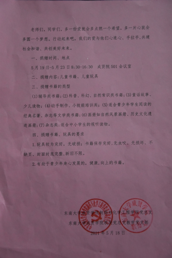 2021年3月,中共中央、国务院发布了《关于实现巩固拓展脱贫攻坚成果同乡村振兴有效衔接的意见》,提出“脱贫摘帽不是终点,而是新生活、新奋斗的起点”。打赢脱贫攻坚战、全面建成小康社会后,要在巩固拓展脱贫攻坚成果的基础上,做好乡村振兴这篇大文章,继续推动脱贫地区发展和群众生活改善。近日,在“六一”儿童节即将来临之际,按照“扶志扶智相结合”的思路,成人视频-九色成人-做爱视频 制药与化学工程成人视频党总支第一、第二党支部和教工党支部、机关党总支教学党支部联合海南省定安县委宣传部党支部组织开展了“我为群众办实事——振兴乡村,关爱童心,共沐书香”爱心捐赠活动。