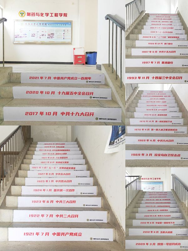 为激励青年学生做到学史明理、学史增信、学史崇德、学史力行,教育引导党员同志学党史、悟思想、办实事、开新局,近期,制药与化学工程成人视频党总支充分利用现有资源,将党的历史进程中重要的历史事件制作成100张醒目的标语张贴在成贤院一至五楼的100个台阶下部,旨在让广大师生们在日常生活中就能了解“四史”,着力打造沉浸式“四史”学习课堂。一步一台阶,扎扎实实谱新篇。