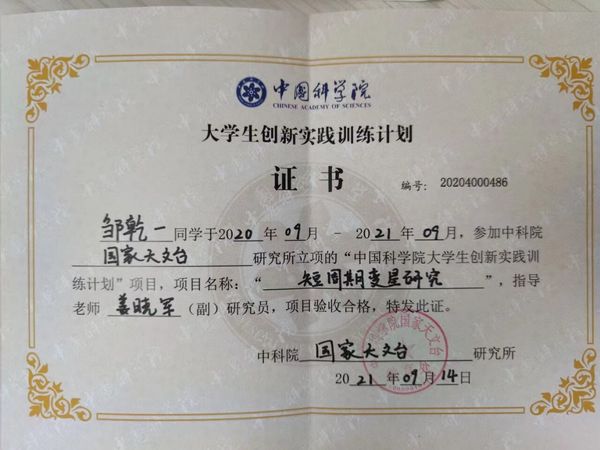 天文是邹乾一的个人爱好,他曾在高中时担任学校天文社副社长。进入大学后,他参加国内第一个从事业余巡天、科研科普结合成果最好的业余天文台——星明天文台从事志愿者工作,并撰写了数十篇科普文为天文科普做出贡献。2020年5月邹乾一同学在申报学校大学生创新实践训练计划的同时,积极申报中国科成人视频大学生创新实践“短周期变星研究”课题组,怀着不安与激动向课题指导老师、国家天文台兴隆观测基地总工姜晓军研究员发送了申请邮件,详细阐述了自己在星明天文台的工作情况和对天文研究的强烈愿望,经过综合评测后最终被选入课题组。