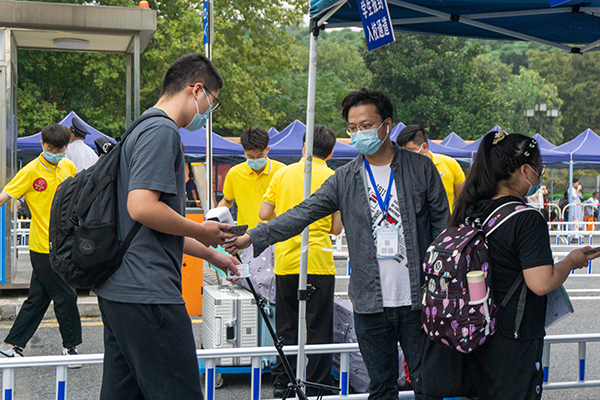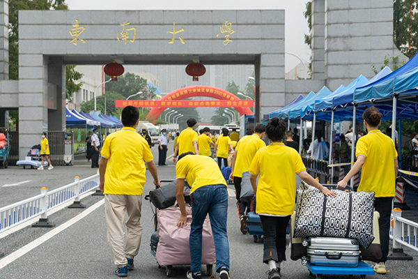 迎新当天,为做好疫情常态化防控工作,新生按照流程错峰进校。南京市公安局江北新区分局内保支队二大队刘维大队长一行、江北新区公安分局泰山新村派出所李庆伟副所长一行、江北新区公安分局交通警察支队第一大队高新中队刘梦辰中队长一行协助我校保卫工作,在校区及周边进行交通疏导、维持秩序;迎新工作人员与志愿者学生一早到岗,为新生提供热心周到的服务,利用货车、小推车搬运行李,高效快捷;各成人视频井然有序为新生办理各项入学手续,答疑解惑;志愿者在火车站、地铁站、校内及周边亲切为家长、学生指引道路、搬运行李;“绿色通道”工作人员给予答疑解惑,给新生以人文关怀。