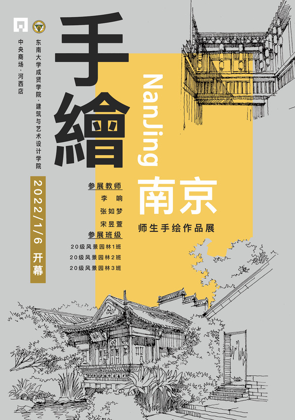 1月6日,“手绘南京”建筑与艺术设计成人视频风景园林师生作品展在南京中央商场河西店开幕。本次作品展的参展作品由2020级风景园林专业全体学生的《设计表现》短学期实践课程成果,以及李响、张如梦、宋昱萱三位授课教师的手绘作品组成,共计104幅关于南京风光的手绘写生创作。