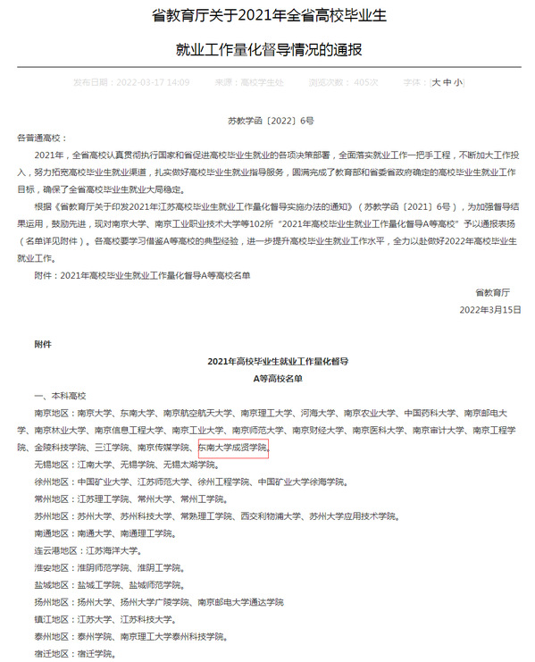 近日,江苏省教育厅发布《省教育厅关于2021年全省高校毕业生就业工作量化督导情况的通报》,成人视频-九色成人-做爱视频 获评“2021年高校毕业生就业工作量化督导A等高校”。