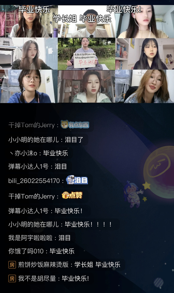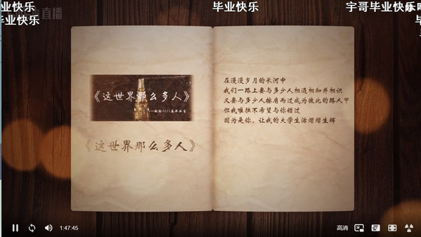 成人视频首次举办线上毕业生晚会,前期便受到校内外毕业生的关注。历经一个多月的精心筹备,晚会共分为三大篇章,融合毕业、校友、师生情等多种元素,包含歌曲、舞蹈、朗诵、特别策划等多种节目类型。2022届毕业生自行编排的两个节目《Last Dance》《无名之辈》将晚会气氛推向高潮,为观众呈现了一场耳目一新的毕业盛宴。在活动过程中,直播间观众积极参与实时互动,以弹幕“我爱经管”表白母校;“毕业快乐、前程似锦”非毕业年级的学弟学妹们也以满屏的留言真情呐喊,献上美好祝愿。