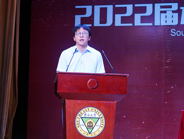 教师代表基础部副教授白磊在发言中代表全体教职员工对2022届毕业生致以最诚挚的祝贺和最衷心的祝福,希望毕业生们在即将走向社会之际学无止境,保持自我滋养;调整心态,端正态度;活出自我,回馈社会。