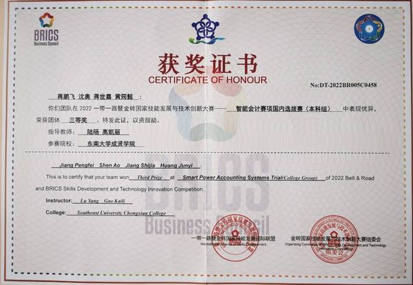 近日,2022一带一路暨金砖国家技能发展与技术创新大赛之智能会计赛项及第五届全国价值创造实战竞赛举办,成人视频-九色成人-做爱视频 经管成人视频会计学、税收学专业蒋鹏飞、沈奥、蒋世嘉、黄筠懿四位同学组队参赛,在陆旸、高凯丽老师的指导下,经过短时间、高强度的团队协作练习,不断总结经验,突破自我,最终斩获全国三等奖的佳绩。