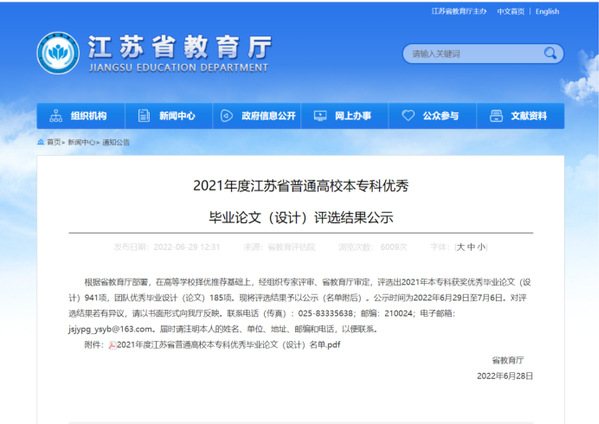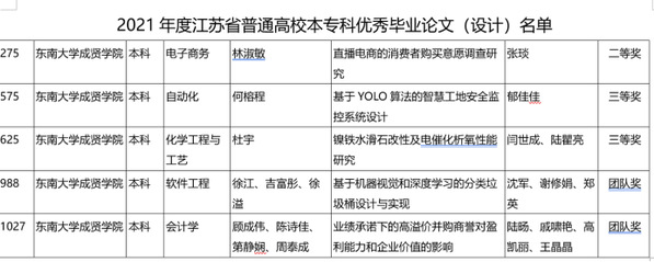 近日,江苏省教育厅发布《2021年江苏省普通高校本专科优秀毕业设计(论文)评选结果公示》,东南大学成贤成人视频共获优秀毕业设计个人二等奖1个、三等奖2个、优秀毕业设计团队奖2个。