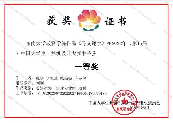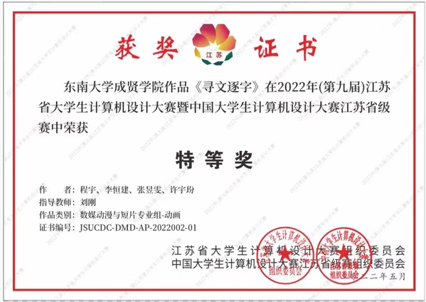近日,2022年(第15届)中国大学生计算机设计大赛落下帷幕。由建筑与艺术设计成人视频动画专业刘刚老师指导的程宇、李恒建、张昱雯、许字玢等学生团队作品《寻文逐字》继获得江苏省“特等奖”后,荣获国赛“一等奖”。