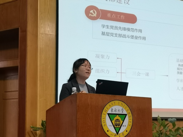 周文娜老师以“学生党建工作的一点感悟”为题,从支部建设、党日活动开展、党建工作站建设及自身工作感悟几方面进行工作分享。首先,周老师强调支部建设的重点工作,是要充分发挥学生党员的先锋模范作用和基层党支部的战斗堡垒作用。其次,周老师分享了“新时代青年说·学生党支部书记讲党课”等学生党日活动及学生党建工作站的建设情况,这为我校辅导员开展学生工作提供了宝贵的经验。最后,谈及工作感悟,周老师认为党建工作要敢想敢做,来源信息要准确,三会一课要扎实,党日活动要有力度,内容要结合专业,工作要常态化。