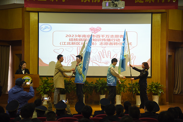由国家卫健委、中国疾病预防控制中心、中国健康教育中心联合发起的“百千万志愿者结核病防治知识传播行动”已开展多年,江北新区公共卫生服务中心的结核病防治工作者代表吴玉蕾医师在会场宣读志愿者倡议。在现场授旗仪式环节,南京市卫生监督所学校卫生监督科科长戴心声、江北新区公共卫生服务中心项目管理科科长洪镭为我校志愿者代表授旗,我校志愿者将和其他高校志愿者携手并肩,将结核病防治知识的传播行动和志愿者公益精神持续进行下去。