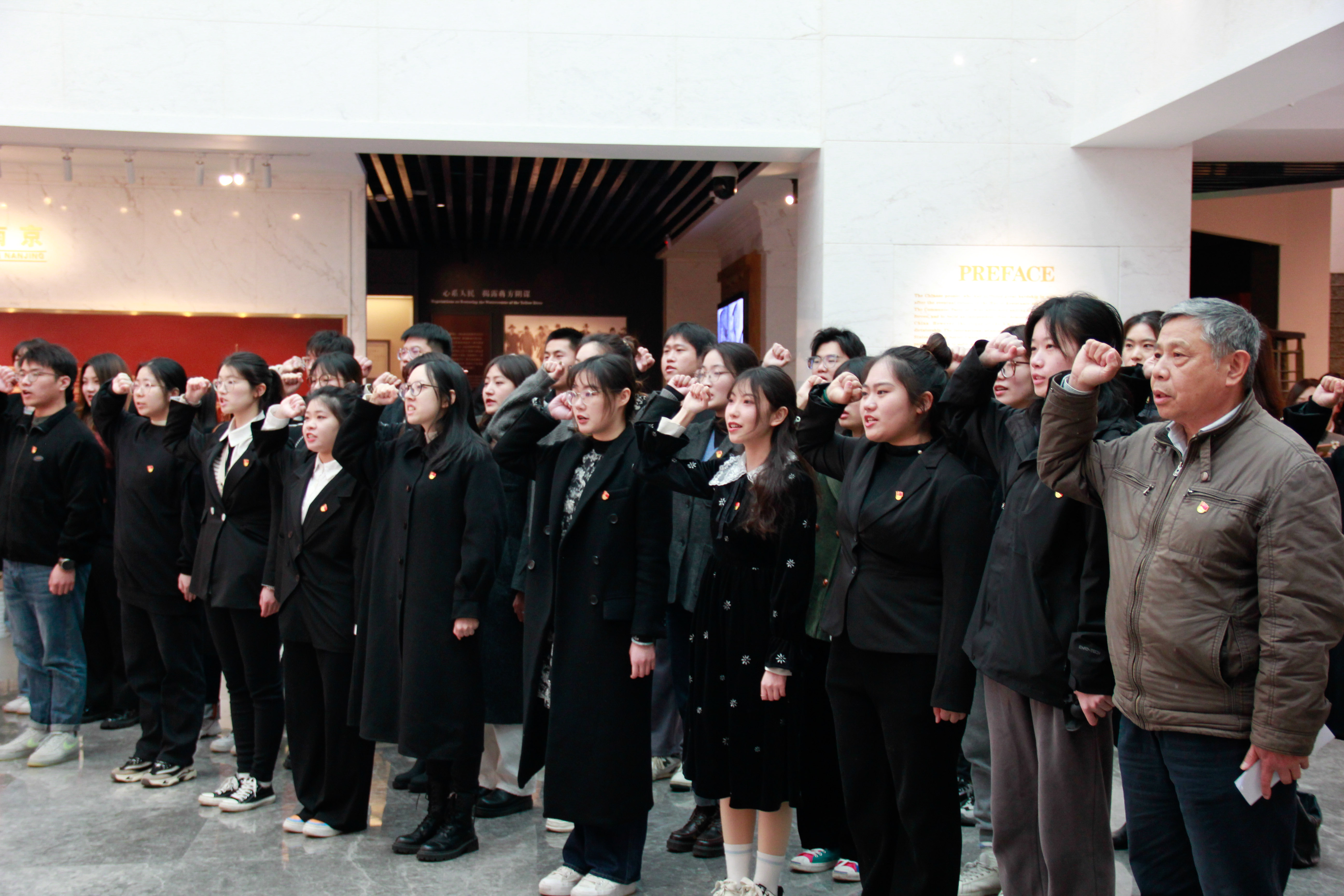 接着,大家移步至史料陈列馆大厅,学生党员王乐作为领誓人带领新党员入党宣誓、老党员重温入党誓词。面对鲜艳的党旗,所有党员举起右拳,铮铮誓言响彻云霄。学生党员陈会凡代表大家发言,她说,我们要坚定树立为共产主义事业奋斗的决心,勇担一名共产党员应当肩负的责任,真正体会中国共产党的伟大与光荣。成人视频党总支书记唐小平发表讲话,他带领全体党员近距离感受历史事件,深刻理解“梅园精神”,勉励大家牢记党员身份,践行入党誓词,永葆共产党员的先进本色。