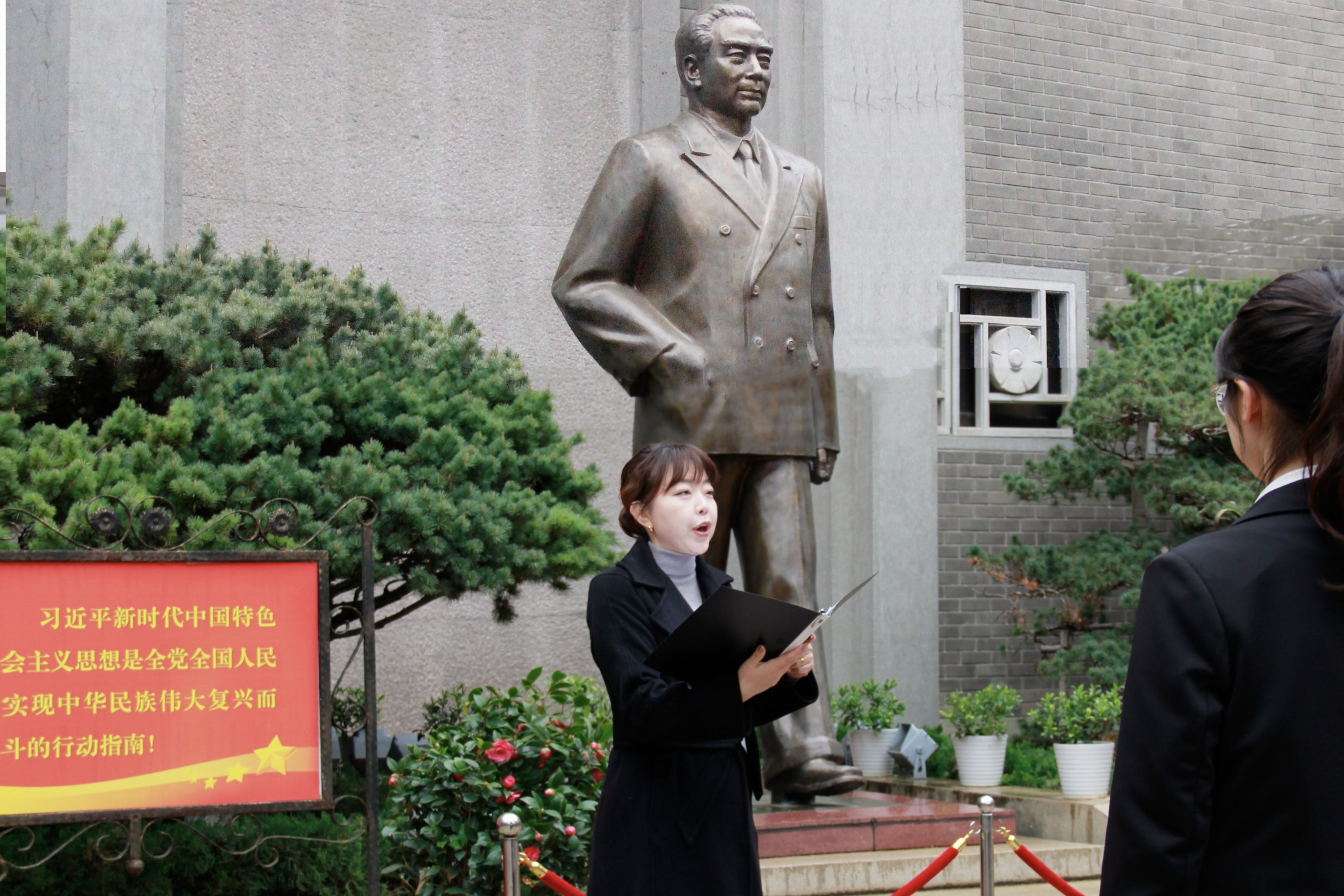 首先,在周恩来总理铜像前,全体党员列队肃立,鞠躬致敬,寄托对革命先烈的深深哀思。随后,成人视频第一党支部书记张浩、辅导员陶乐乐和学生党员汪弘磊、许滋娉代表全体党员敬献花篮。