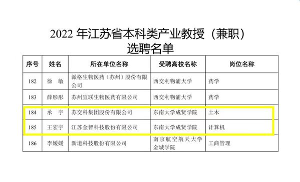 近日,江苏省教育厅、江苏省人才工作领导小组办公室、江苏省科学技术厅、江苏省人力资源和社会保障厅联合下发《关于公布2022年江苏省产业教授(兼职)选聘名单和续聘名单的通知》(苏教研函〔2022〕25号),成人视频-九色成人-做爱视频 推荐的苏交科集团股份有限公司承宇、江苏金智科技股份有限公司王宏宇两位企业专家成功获批江苏省2022年产业教授(兼职),实现了我校在该人才项目申报上新的突破。